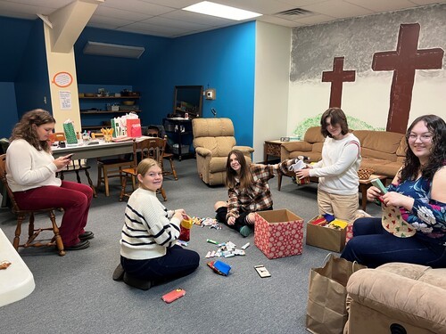 Explorers of Faith Sunday School Class working on a project to fill Christmas stockings for the residents of the William Penn Care Center.