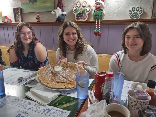 After completing our Christmas stockings project for the residents of the William Penn Care Center, the class was invited to breakfast at Wades in Export. Audrey Wolfgang had no idea when she ordered Al’s Big Breakfast that she’d be served such a gigantic pancake!